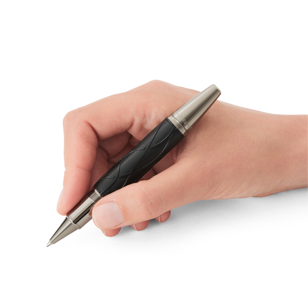 "Once upon a time..." The Montblanc Writers Edition Homage to Brothers Grimm is dedicated to Jacob and Wilhelm Grimm and celebrates their work on German and European folk tales among which are some of the most famous fairy tales such as "Snow White", "Cinderella" and "Sleeping Beauty". The overall silhouette of the writing instrument is shaped like an old hiking stick and the Black colour resembles the darkness of the woods which usually serve as the main stage for the Brothers Grimm´s folklore. In addition, the wave-like pattern on the cap and barrel is inspired by Rapunzel´s hair while also resembling roots as the Brothers Grimm viewed their linguistic work as "research into roots". The cap is crowned by the Montblanc Emblem in precious resin. The platinum-coated clip, reminiscent of a knobby piece of wood, surprisingly reveals the silhouette of the profile of the Brothers Grimm when turned.