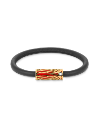 주얼리에는 블랙 레더 브레이슬릿과 PVD 코팅 및 코랄 래커 처리된 스테인리스 스틸 소재의 튜브가 장착되어 있습니다 (사이즈 60). 아카이브 솔리테어 패턴에서 영감을 받았습니다.